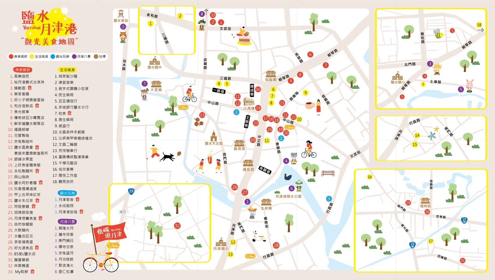 走進臺南鹽水,就像翻開一本活的歷史書;這座小鎮因港灣曲折如彎月而得名「月津」,早在明清時期便是南台灣重要的商貿港口;貨物、文化、信仰在此交匯,留下了獨特的街區格局與多元的廟宇建築;清代文人蔡和泉更以詩詞,為鹽水留下了「月津八景」的文化印記,這八景將自然風光、廟宇景致與庶民生活融會其中,既是文人雅士的抒懷,也映照了小鎮的生活場景。今日,鹽水以 「月津八景公仔」 的形式再現經典,透過可愛俏皮的裝置藝術,串聯起城市的街區散策,搭配集章活動與鐵馬遊程,鹽水小鎮展現出既傳統又新潮的風貌,讓旅人能一邊踩踏單車,一邊閱讀歷史、一邊享受美食。