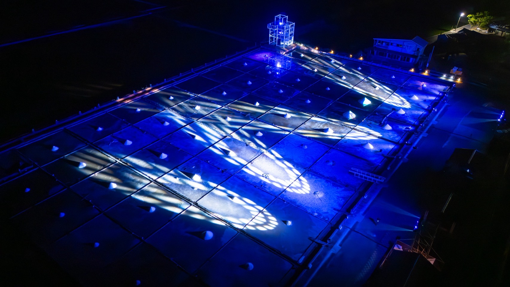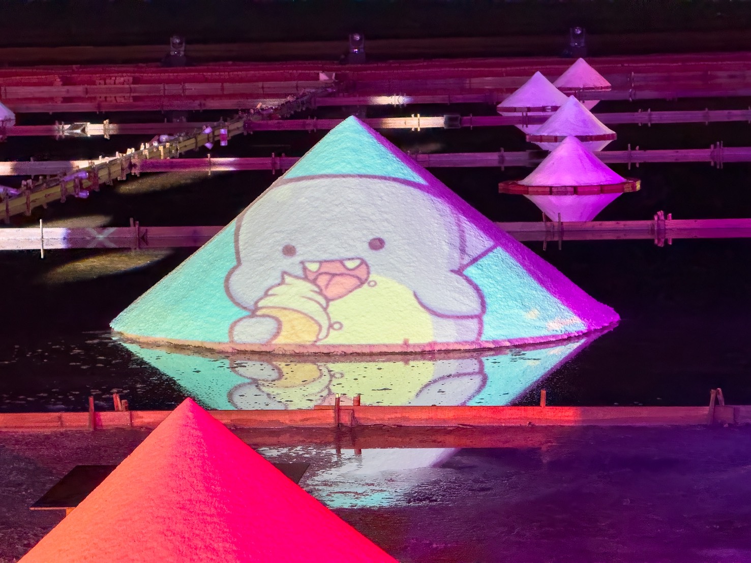 雲嘉南管理處處長徐振能表示,井仔腳瓦盤鹽田擁有超過200年歷史,白日的壯麗景色與夜間光雕的繽紛變化,展現截然不同的風貌。今年藝術季特別邀請人氣角色《胖鯊魚鯊西米》跨界合作,以童趣的形象串連鹽田、海岸與小鎮之間的故事,讓觀眾在光影流動中體驗鹽業文化的多重層次。光雕演出結合聲音、投影與節奏設計,讓歷史場域在科技藝術的詮釋下獲得新生命,呈現出一場融合文化與創新的視覺盛宴。