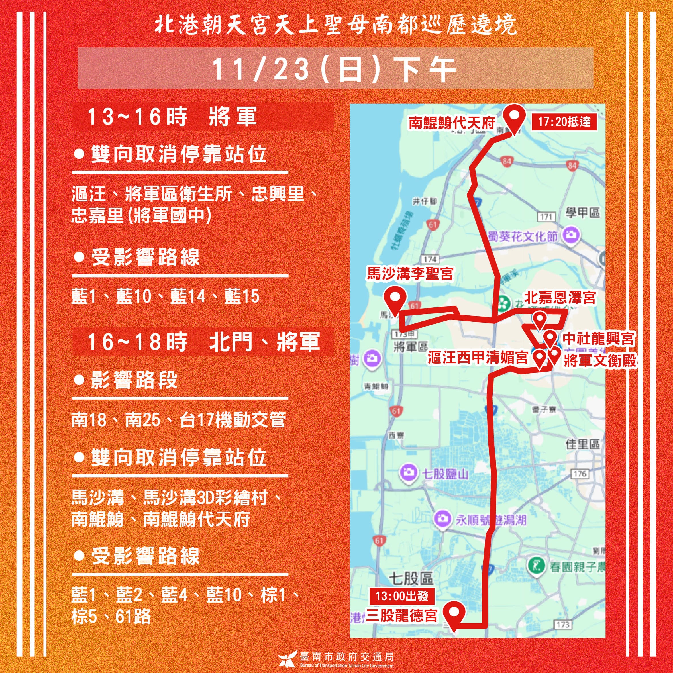 「北港媽祖南都巡歷 11/20 起進入台南市區 交通局籲民眾提前改道避塞」