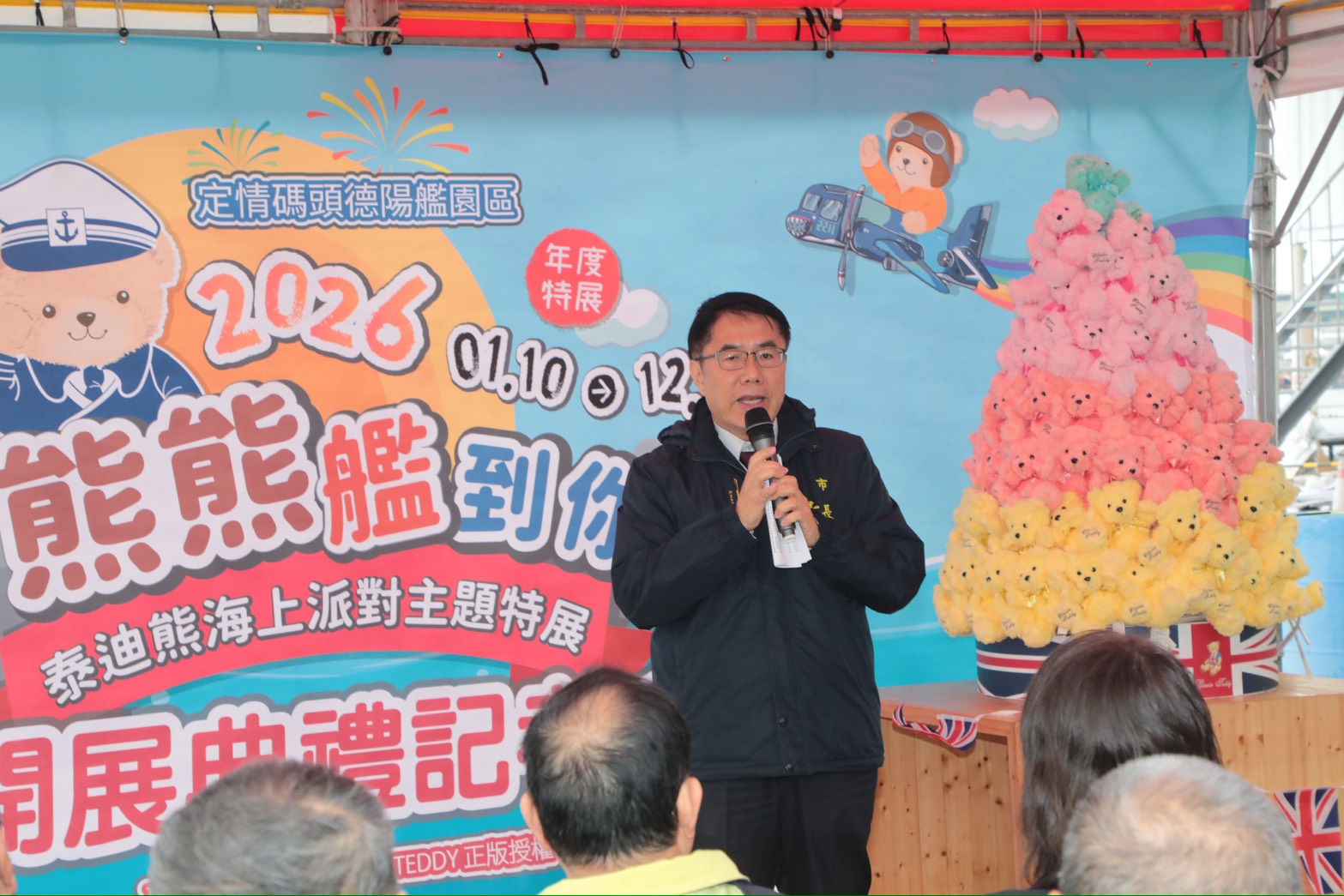 台南市長黃偉哲親自出席「熊熊艦到你・2026泰迪熊海上派對主題特展」開展記者會,邀請民眾一同體驗德陽艦園區的海上主題魅力。右為佳馳國際有限公司董事長謝兆翰。