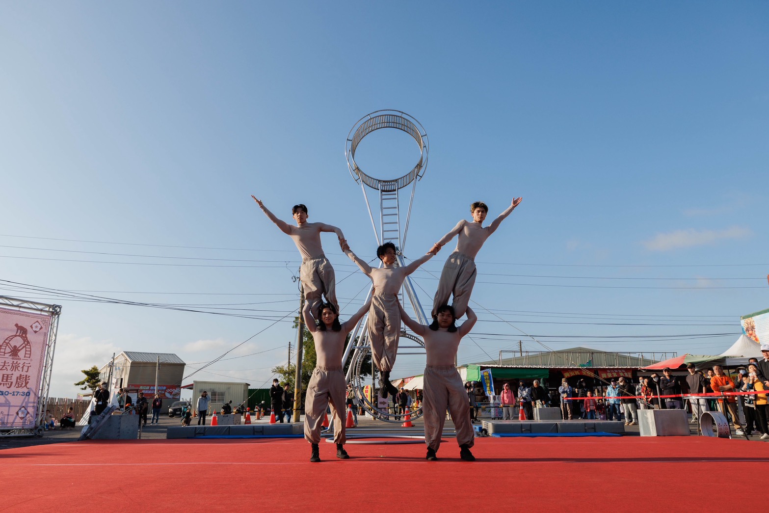 「神廟大馬戲」突破傳統舞台框架,將10公尺高巨輪移至廟埕廣場,演出團隊在高空巨輪上進行高速移動、翻轉與平衡動作,並結合跑酷及高空走繩技巧,展現極高技術門檻。表演現場搭配鹽田景致,讓觀眾近距離感受驚險與美感兼具的馬戲藝術,並透過魔術表演增添互動樂趣,使全家大小皆能享受視覺饗宴。