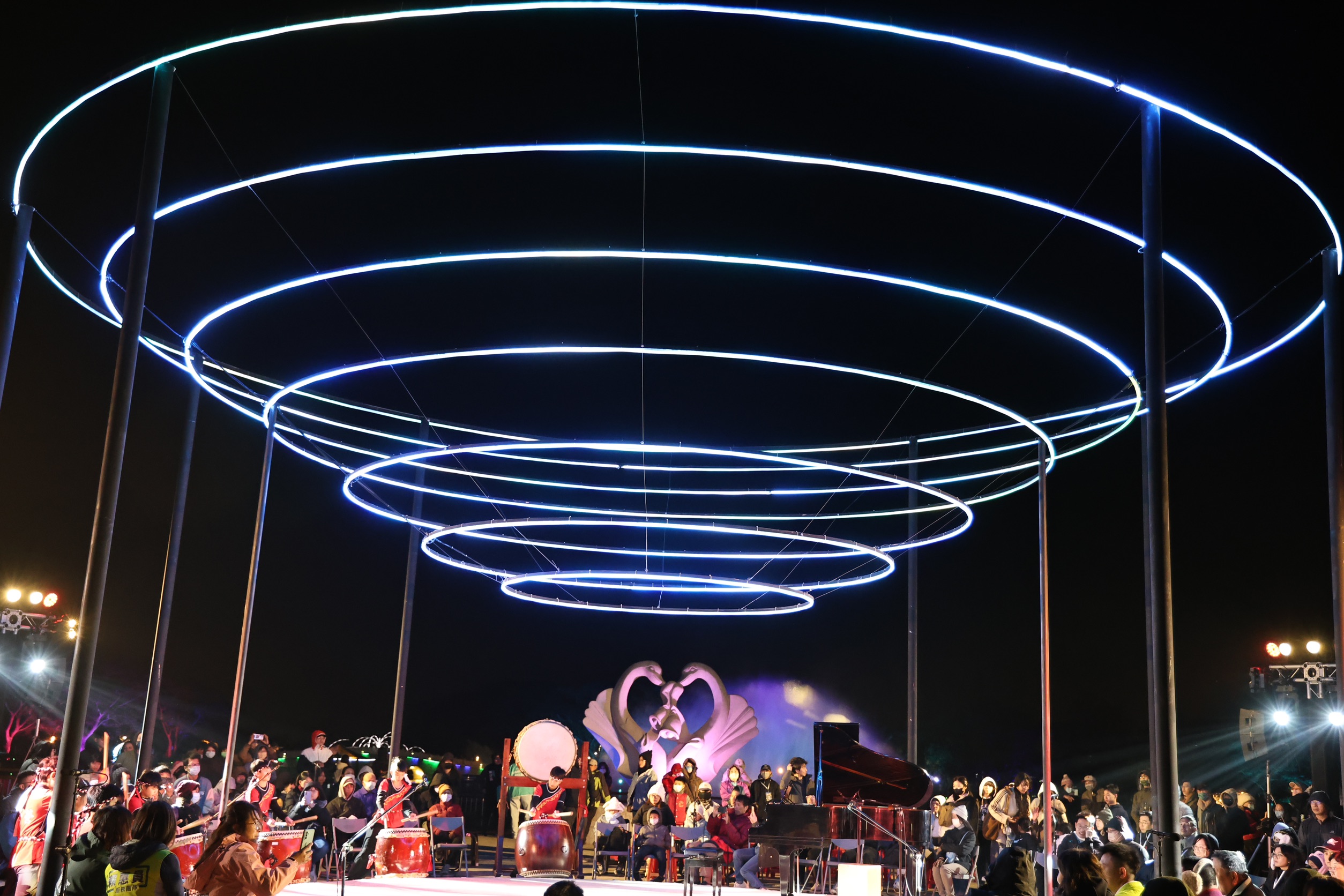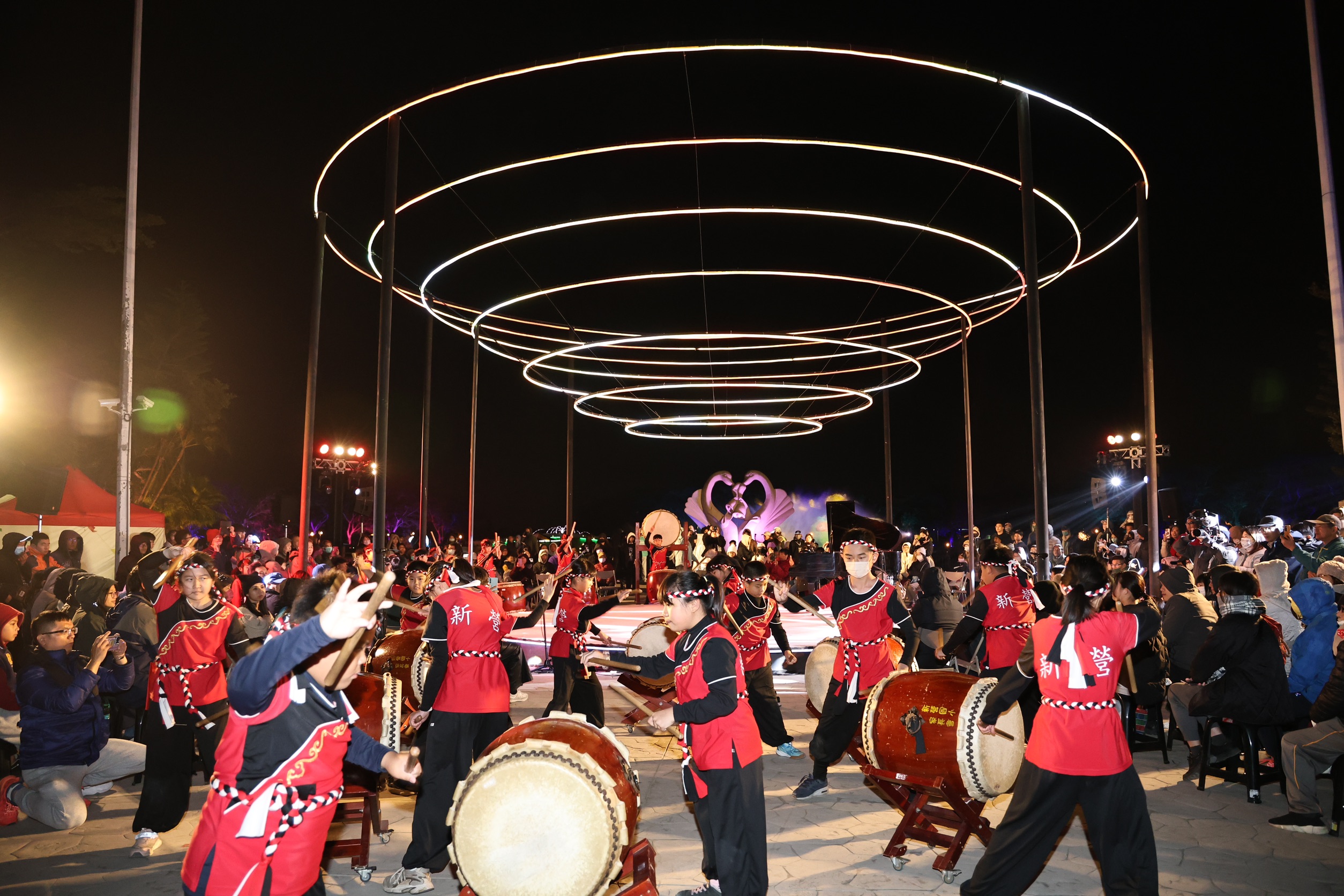 開幕夜由新營國小太鼓隊帶來震撼演出,在層層光環裝置下擊鼓迎賓,炒熱現場氣氛。
