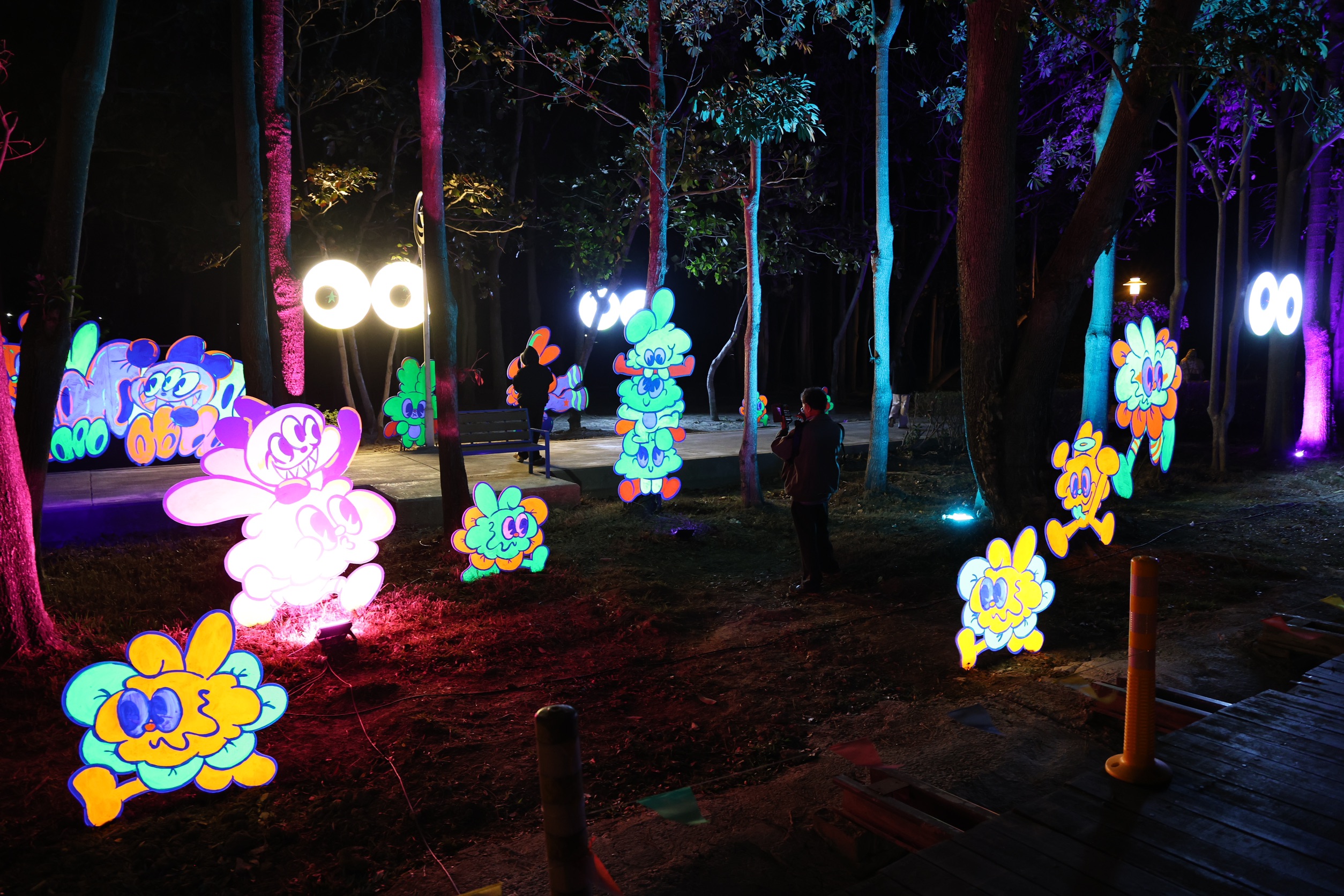 原創插畫IP角色「光兔DILO」與「鼠尼SUNI」化身為燈區主角,穿梭於林間光環境中,為新營波光節增添童趣與療癒氛圍。