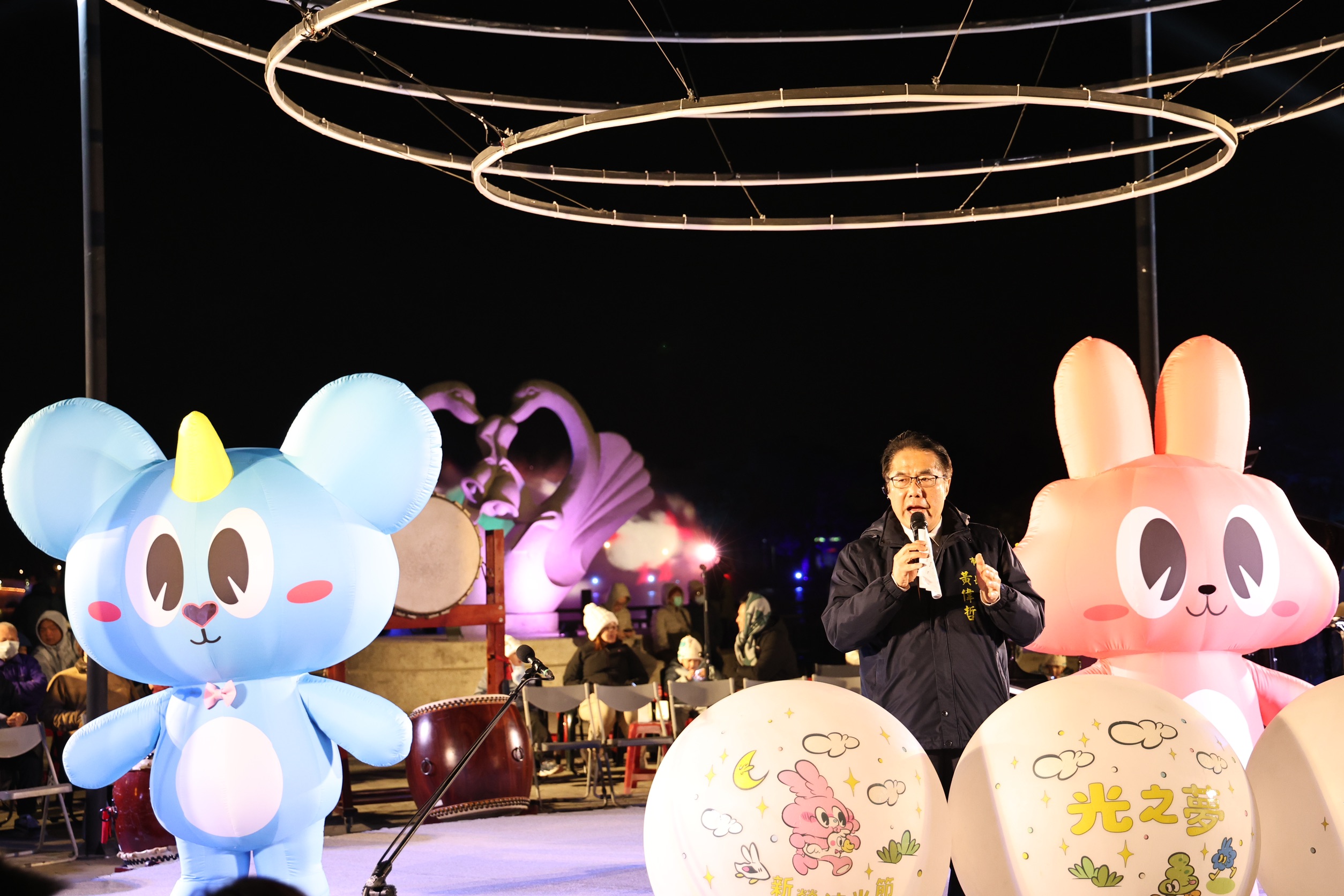 市長黃偉哲於開幕儀式致詞,身旁為原創IP角色「光兔DILO」與「鼠尼SUNI」大型裝置,象徵以角色敘事串聯光影藝術,打造天鵝湖夢境場域。