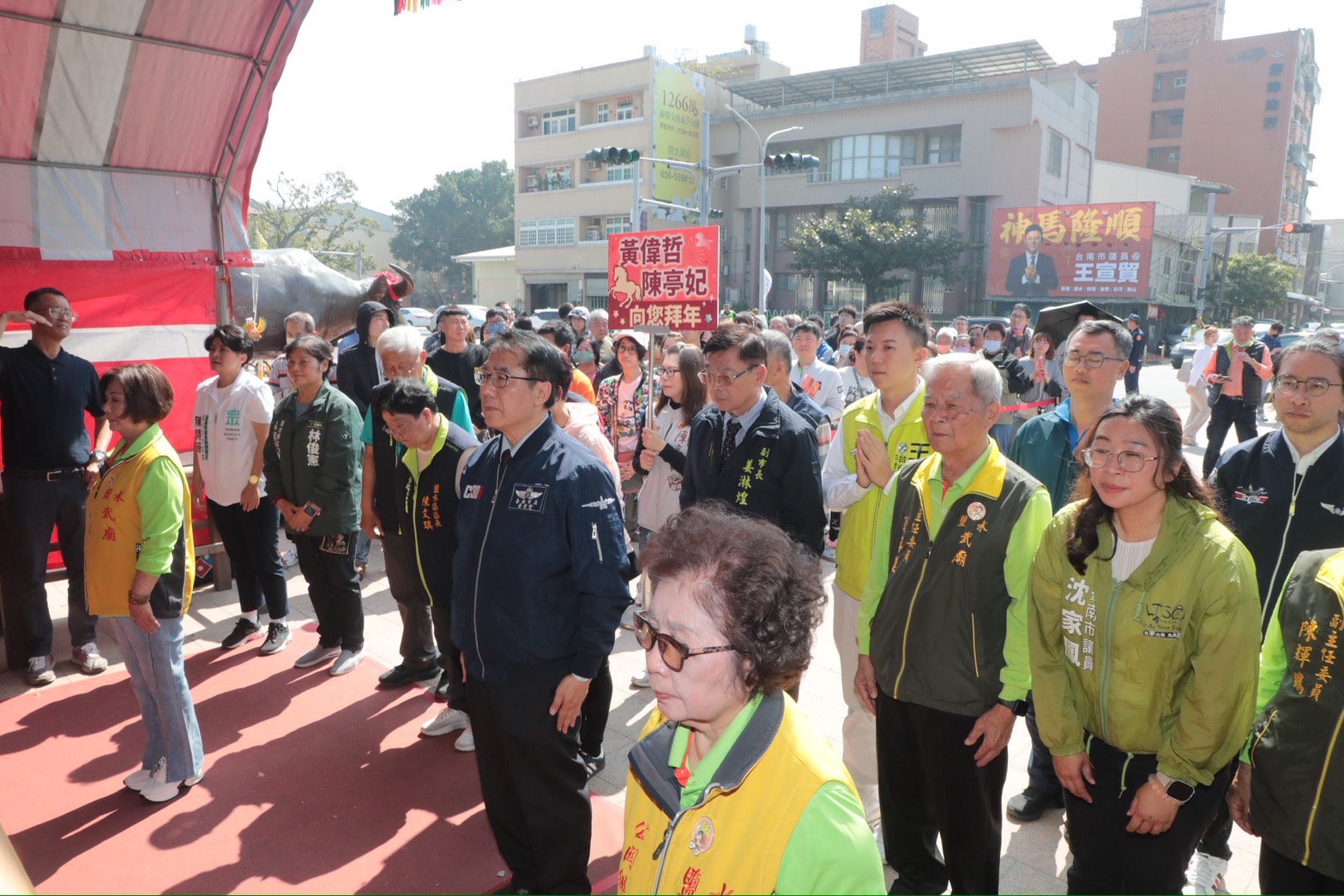 農曆除夕,台南市長黃偉哲今(16)日上午在副市長姜淋煌陪同下,走訪新營同濟宮及鹽水武廟等廟宇參香祈福,虔誠祝禱新的一年風調雨順、國泰民安、市運昌隆,並提前向市民拜年發送馬年紅包,祝福闔家平安、萬事如意,在濃厚年節氛圍中迎接嶄新一年。