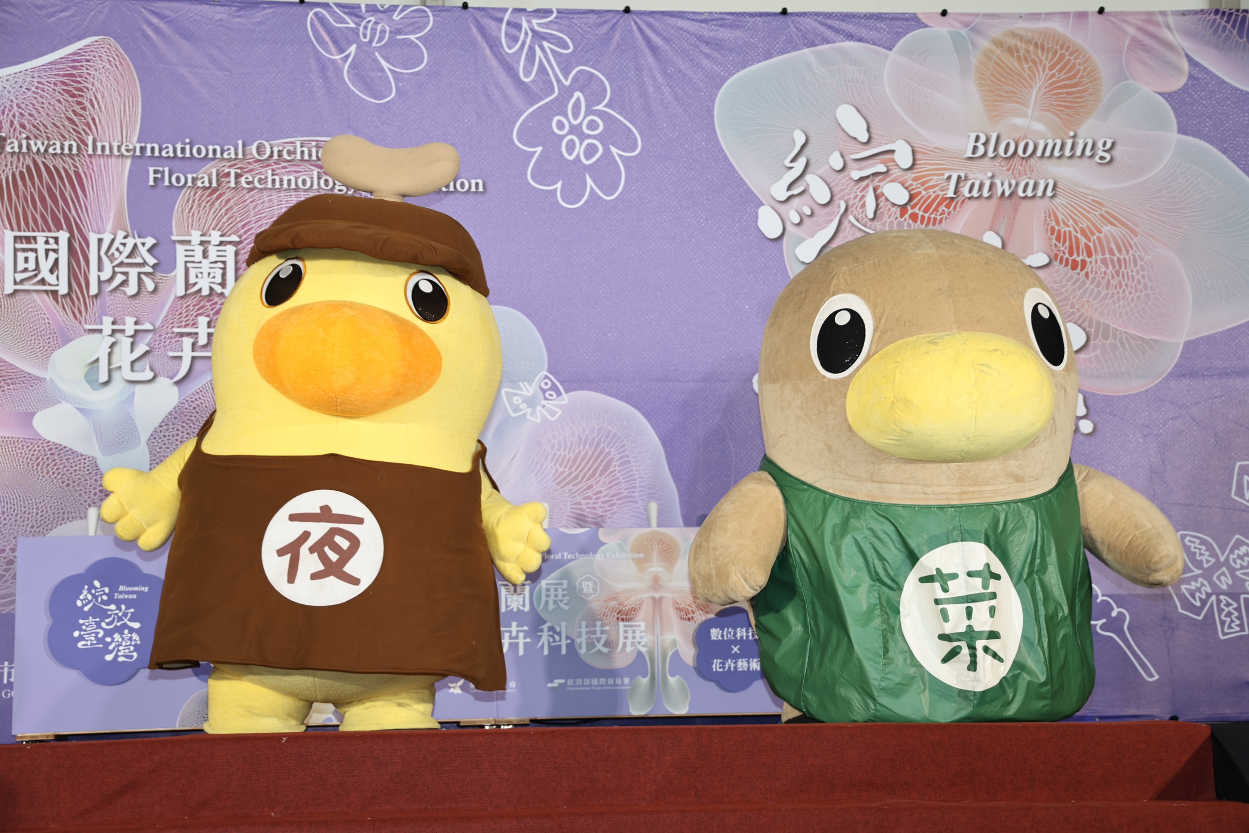 台南吉祥物「菜奇鴨」、「夜奇鴨」在展前記者會開場演出
